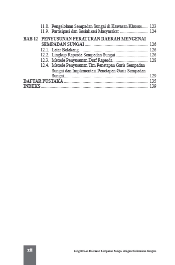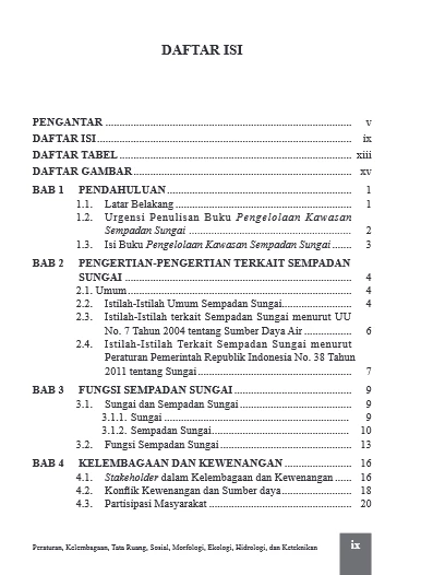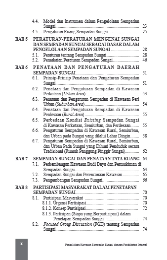 Sempadan sungai akan menjadi permasalahan yang paling krusial dalam penataan kawasan sepanjang alur sungai. Hal ini karena penataan sempadan sungai menyinggung masalah kepemilikan lahan, ekosistem sungai, kelembagaan, bencana alam, aset vital milik privat/publik dan masalah sumberdaya air yang kompleks. Buku ini memberikan penjelasan secara akademis dan praktis interdisipliner bagaimana menentukan garis sempadan dan manfaatnya bagi ekosistem sungai maupun manfaat bagi masyarakat luas yang berkeadilan. Untuk meyakinkan masyarakat, maka diketengahkan semua peraturan-peraturan terkini maupun yang sudah diganti terkait sempadan sungai, baik peraturan terakhir maupun peraturan sebelumnya. Bagaimana menentukan tepi sungai sebagai hal yang paling sulit dalam penetapan garis sempadan sungai, dalam buku ini dijelaskan secara mendetail. Jika daerah ingin membuat Perda tentang Sempadan Sungai, maka buku ini menjelaskan langkah-langkahnya dan substansi yang harus ada pada Perda tersebut. Buku ini menjelaskan juga tentang tata urutan pembentukan Tim Penetapan Garis Sempadan Sungai (sebagaimana diamanatkan PP 38/2011), dan kerja tim tersebut sampai ketetapan sempadan diimplementasikan dan “patok” nyata garis sempadan dipasang dengan aman dan terpelihara.