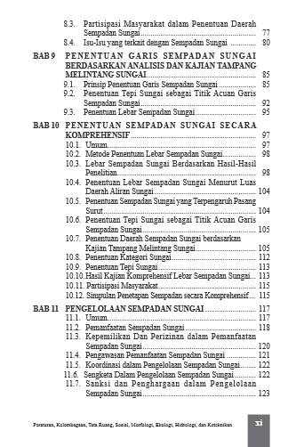 Bagaimana menentukan tepi sungai sebagai hal yang paling sulit dalam penetapan garis sempadan sungai, dalam buku ini dijelaskan secara mendetail. Jika daerah ingin membuat Perda tentang Sempadan Sungai, maka buku ini menjelaskan langkah-langkahnya dan substansi yang harus ada pada Perda tersebut. Buku ini menjelaskan juga tentang tata urutan pembentukan Tim Penetapan Garis Sempadan Sungai (sebagaimana diamanatkan PP 38/2011), dan kerja tim tersebut sampai ketetapan sempadan diimplementasikan dan “patok” nyata garis sempadan dipasang dengan aman dan terpelihara.